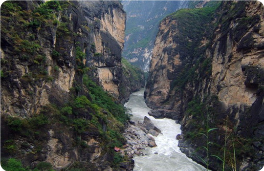在云南省麗江納西族自治縣石鼓東北。長江上游金沙江到此急轉北流。峽谷長16公里,右岸玉龍雪山主峰海拔5,596米,左岸中甸雪山海拔5,396米,中間江流寬僅30~60公尺?;⑻鴯{的上峽口海拔1,800公尺,下峽口海拔1,630公尺,兩岸山嶺和江面相差2,500~3,000公尺,谷坡陡峭,蔚為壯觀。江流在峽內連續下跌7個陡坎,落差170公尺,水勢洶涌,聲聞數里。當年堯茂書的探險隊就曾經在此漂流,雖英雄壯志未酬身先去,此地卻因此而名聲大振。