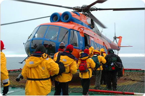 開始南行穿過遠古陳積的古老厚冰層,搭乘直升機俯視觀賞,并在特殊景觀處停船,旅客由舷梯登陸,在一望無際廣闊的冰原上欣賞奇妙風光。