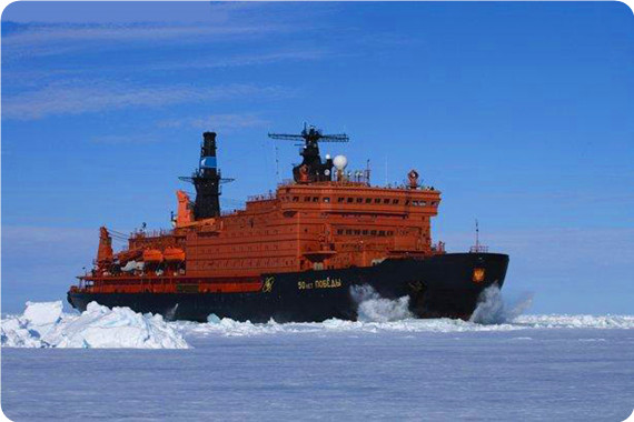 向北極航行,航行中可觀賞北極嘆為觀止的特有風光。50年勝利號是超級核動力破冰船,可以切開4-5米的厚冰,旅客們能夠親眼目睹船頭如何憑借其巨大的馬力把海上的厚冰壓碎,船身輾過冰層時所發出的如同9級地震的巨大撞擊聲會給人留下深刻的印象。船上直升機隨時待命起飛,除了擔任空中偵查,協助破冰續航外,還可搭乘旅客,鳥瞰冰河、冰山以及破冰船破冰前航冰破天驚的壯觀景象。