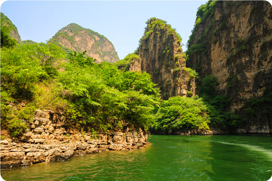 龍慶峽,一直被人們譽為北京的“小漓江”。龍慶峽水庫高聳的大壩相連著兩座山,其寬有四五十米,大壩猶如一把白色的巨鎖把龍鎖住了。登上大壩俯瞰北面,墨綠色的水面倒影著山巒和白云。東西的兩座山,峭壁直立,象刀切似的,足有幾十丈高,“龍慶峽”可能由此峽而得名。那千姿百態的山和石,有的像出鞘的劍,有的像舉起的大錘,有的像昂首的虎,有的像扭著頭的象。因此人們根據它們的形狀取名為“震山如來”、“雞冠子山”、“金缸山”等等。